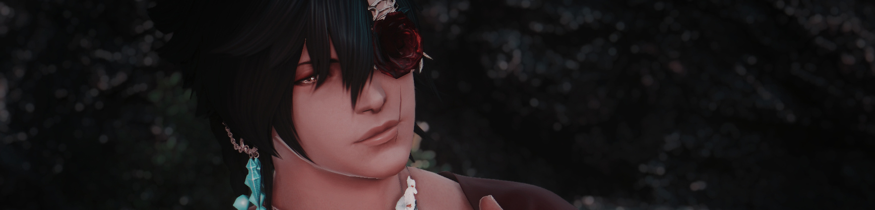 Hardly of noticeable stature, Lukkas stands as tall as any Hyur, muscular as befit an adventurer, but with a slim waist and a face some would would describe as a pretty boy with light gold eyes and tanned complexion.His black hair is often unruly, with bangs slicked back and constantly falling loose, with two long braided extensions behind his right ear that wind into golden clasps and crystalline arrowheads.A deep red scar mars his face, across his nose and over his left cheek, as with another that crosses the corner of his lips. Splashed over his left temple, a golden, almost metallic, indistinct marking seems to continue down in a spiral down his neck and arm in a coil of dravanian-like scales with a lenticular effect. It is accented by harsh dark wave-like inks and soft pink lotus flowers, an artistry done unto him by a dear friend.He tends to lean into attire that flatters his form or shows it off, and despite his attitude, he is quite prideful in his appearances.