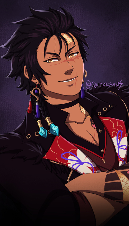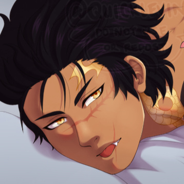 Hardly of noticeable stature, Lukkas stands as tall as any Hyur, muscular as befit an adventurer, but with a slim waist and a face some would would describe as a pretty boy with light gold eyes and tanned complexion.His black hair is often unruly, with bangs slicked back and constantly falling loose, with two long braided extensions behind his right ear that wind into golden clasps and crystalline arrowheads.A deep red scar mars his face, across his nose and over his left cheek, as with another that crosses the corner of his lips. Splashed over his left temple, a golden, almost metallic, indistinct marking seems to continue down in a spiral down his neck and arm in a coil of dravanian-like scales with a lenticular effect. It is accented by harsh dark wave-like inks and soft pink lotus flowers, an artistry done unto him by a dear friend.He tends to lean into attire that flatters his form or shows it off, and despite his attitude, he is quite prideful in his appearances.